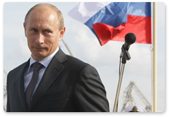 Prime Minister Vladimir Putin took part in the ceremony of raising the national flag on the new icebreaker St Petersburg at the Baltiysky Zavod (Baltic Shipyard)